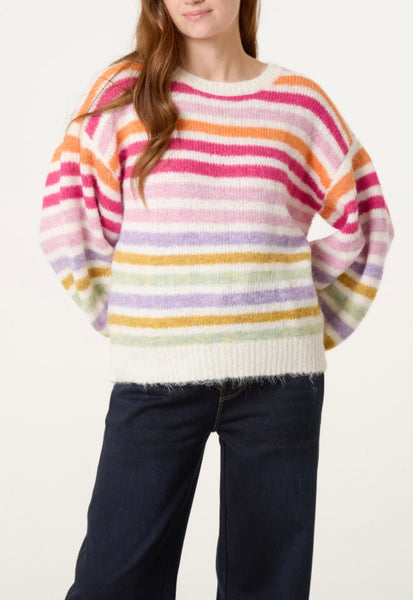 Inject a burst of joy into your wardrobe with our incredibly soft, colourful striped knit jumper. This vibrant piece features a playful mix of both pastel and bright stripes in pink, orange, yellow, mint green, and lavender, ensuring you stand out for all the right reasons. Crafted from a cosy blend including wool for warmth, it offers a relaxed, comfortable fit perfect for layering over your favourite denim. The slightly ballooned sleeves add a touch of unique, elegant & contemporary style. It's colourful but not garish, and ultra soft to the touch – a must-have for brightening up those grey British days we know all too well!