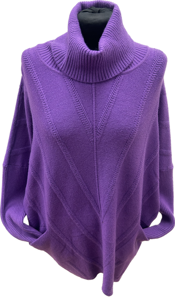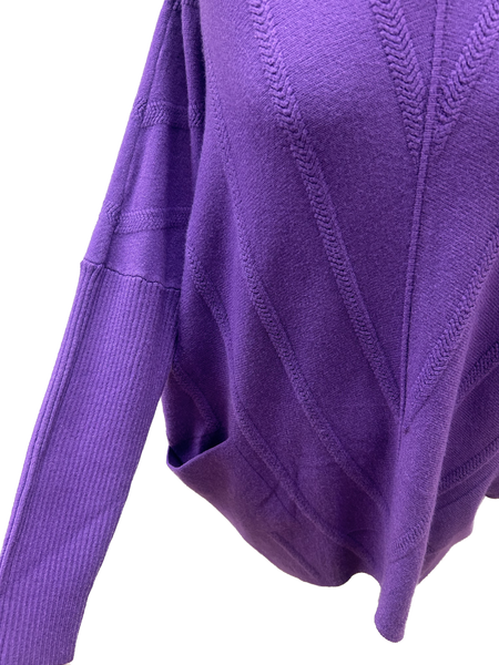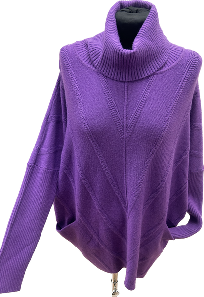 Gorgeous rich purple colour cowl neck soft & cosy knitted jumper. Featuring a gorgeous neckline, long sleeves & two pocket detail along with chevron design in the knitwear & quirky V shaped dipped hemline.