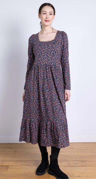 This dress is perfect for the modern, eco-conscious woman who seeks fashion that aligns with her values. Crafted from premium organic cotton, it's a sustainable choice that allows you to look and feel your best. Embrace the beauty of effortless elegance with this dress. The rich, dark base and vibrant print create a striking contrast, while the tiered design flatters your figure. Thoughtful details like the pockets and square neckline make this piece both stylish and practical. Slip into this dress and let your confidence shine.